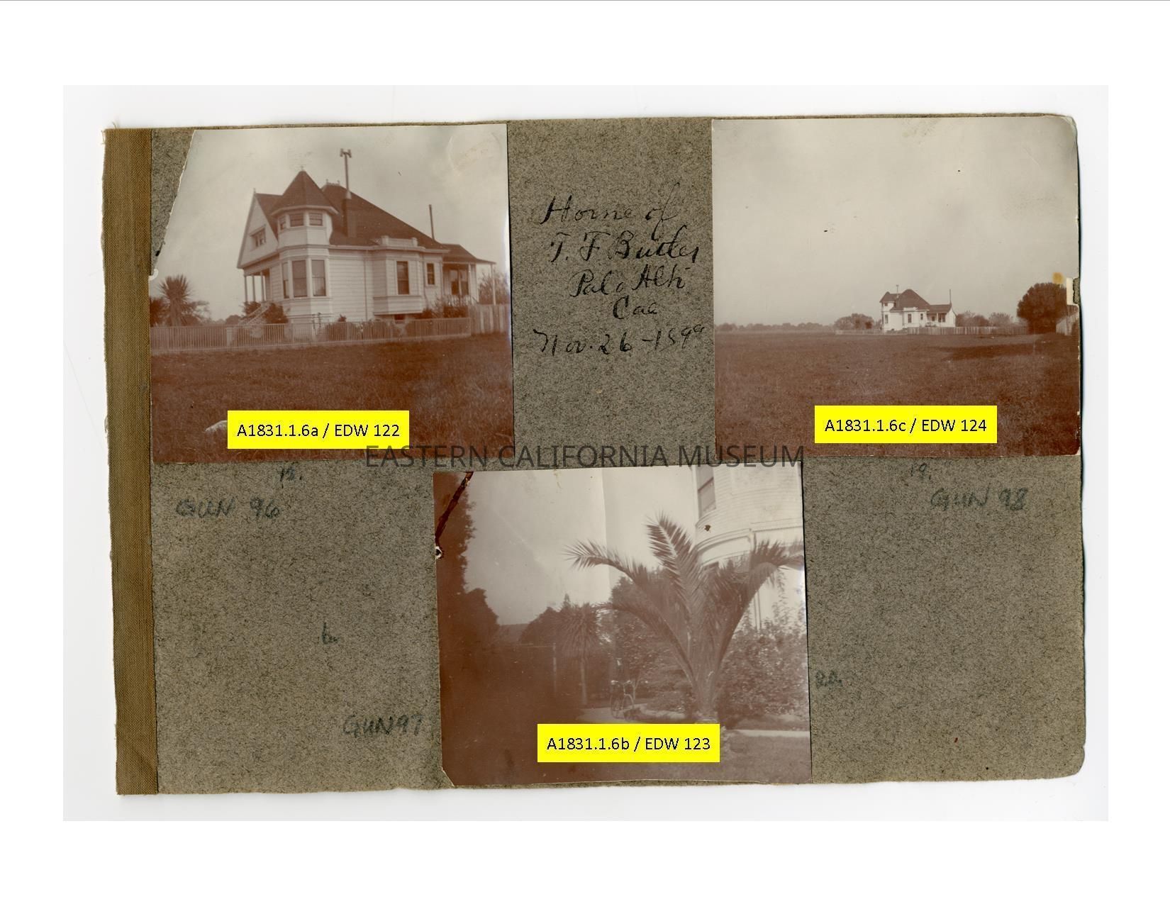 A1831.1.6b: Photo taken from a distance of a two story house identified as the home of T. F. Butler in Palo Alton on November 26, 1899.