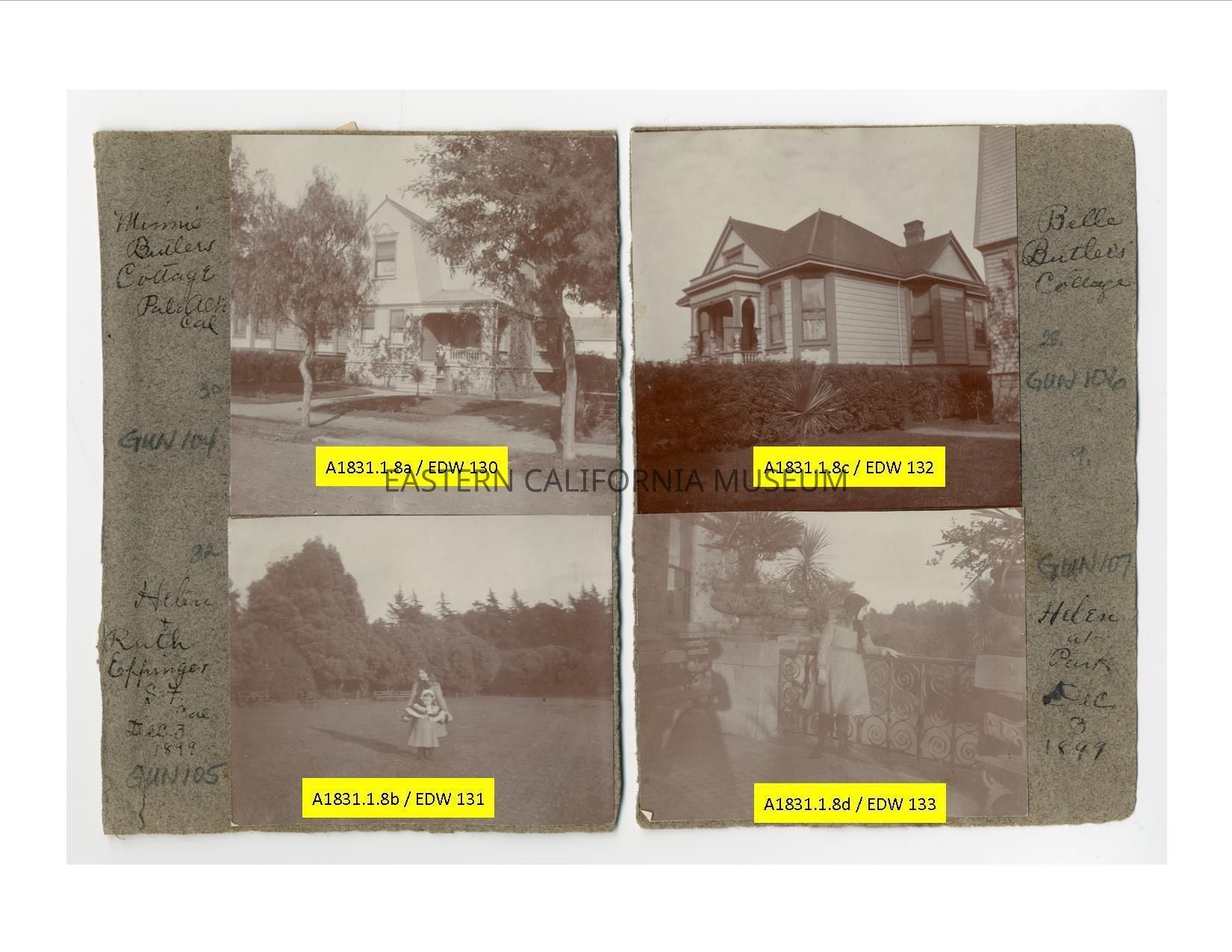 A1831.1.8b: Exterior photo of two young girls standing in a lawn or park. They are identified as Helen [Gunn] and Ruth Effinger in San Francisco, December 3, 1899.
