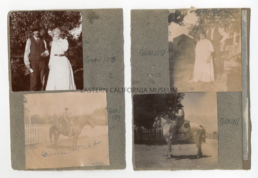 A1831.1.9b: Photo of a woman on horseback in front of a white picket fence. She is identifed as Irma Webb. Photo is badly faded.