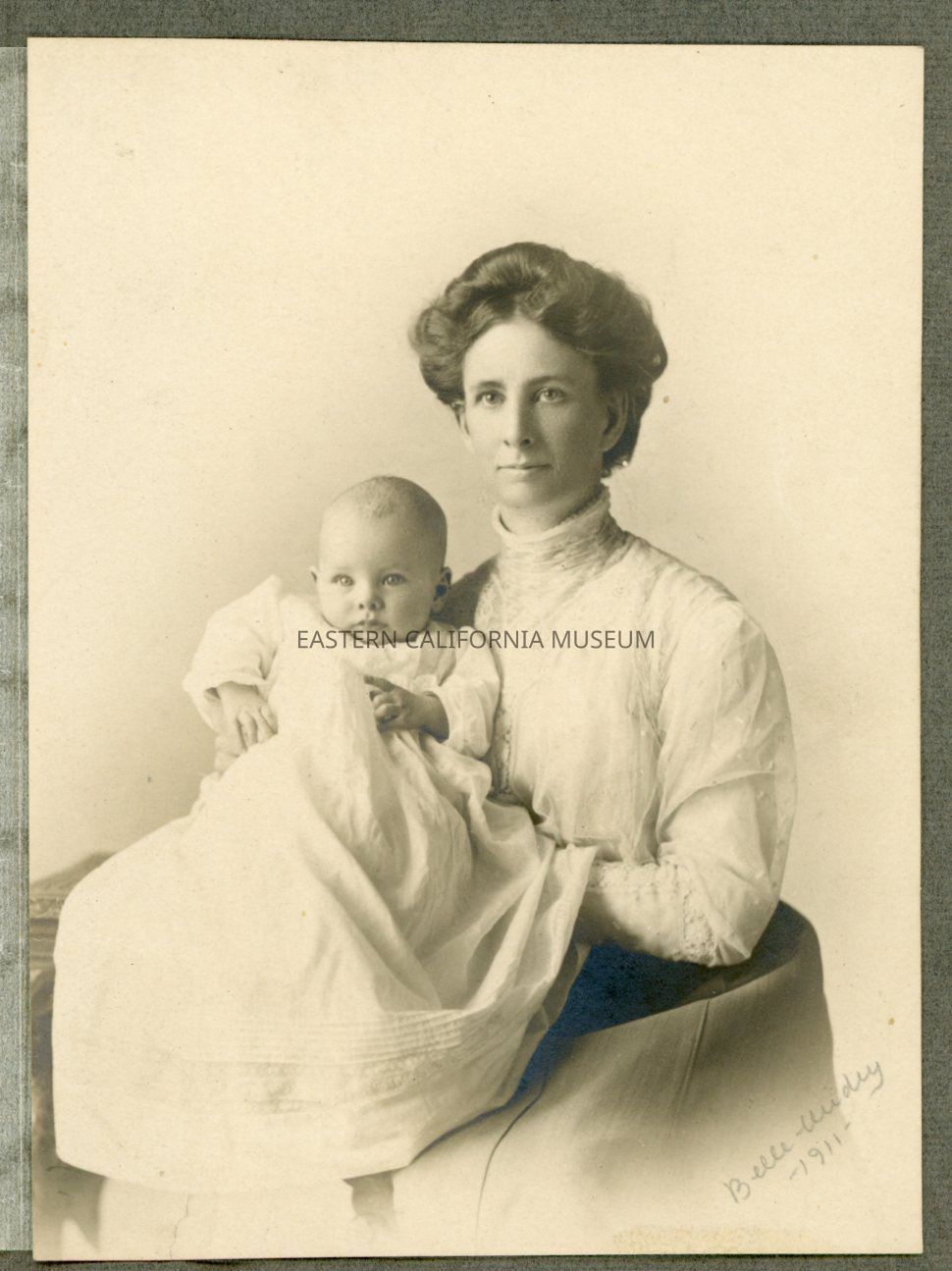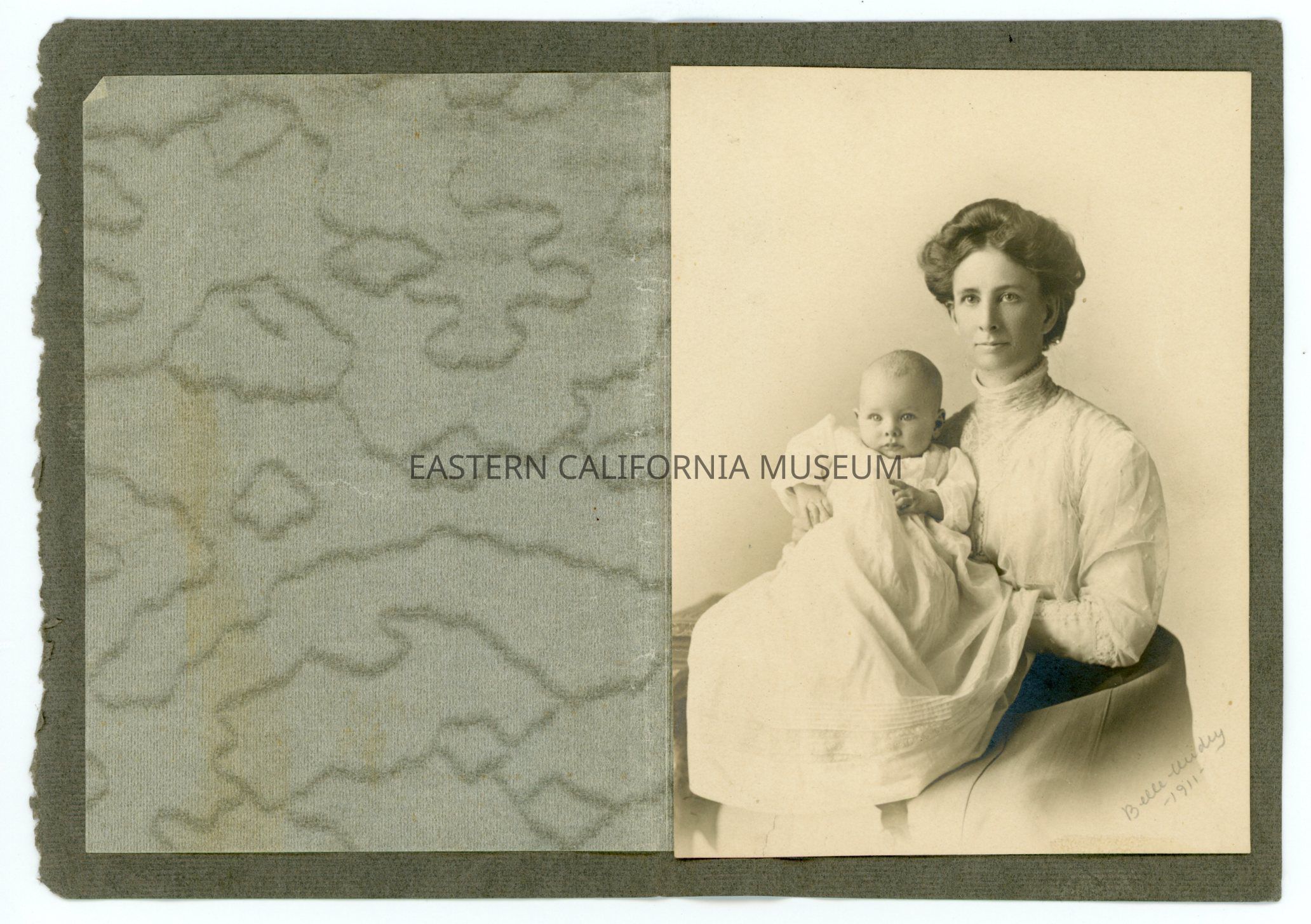Photo in protective folding mat of a young woman holding a baby. Written in pencil in the lower right corner is "Belle [illegible], 1911."