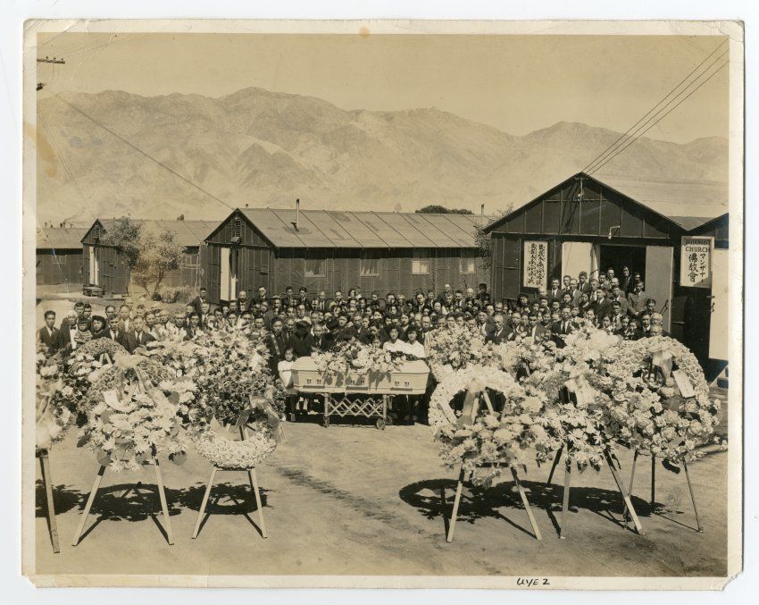 Exterior photograph of funeral scene outside of building with more than 140 people standing behind a coffin in front of the open doors to building. Building has sign stating it is Buddhist Church. On top of coffin and on stands next to coffin are several flower arrangements. The Inyo Mountains are visible in background. A label on a yellow post-it on upper right corner identifies the deceased person as: "July 10, 1944, Keiji Suruki's Funeral, Res. at 24-10-1".Photograph Details