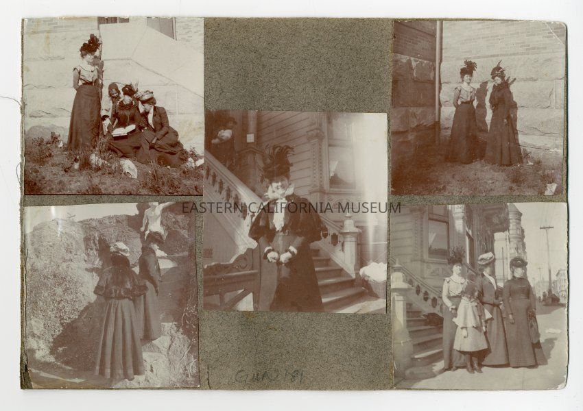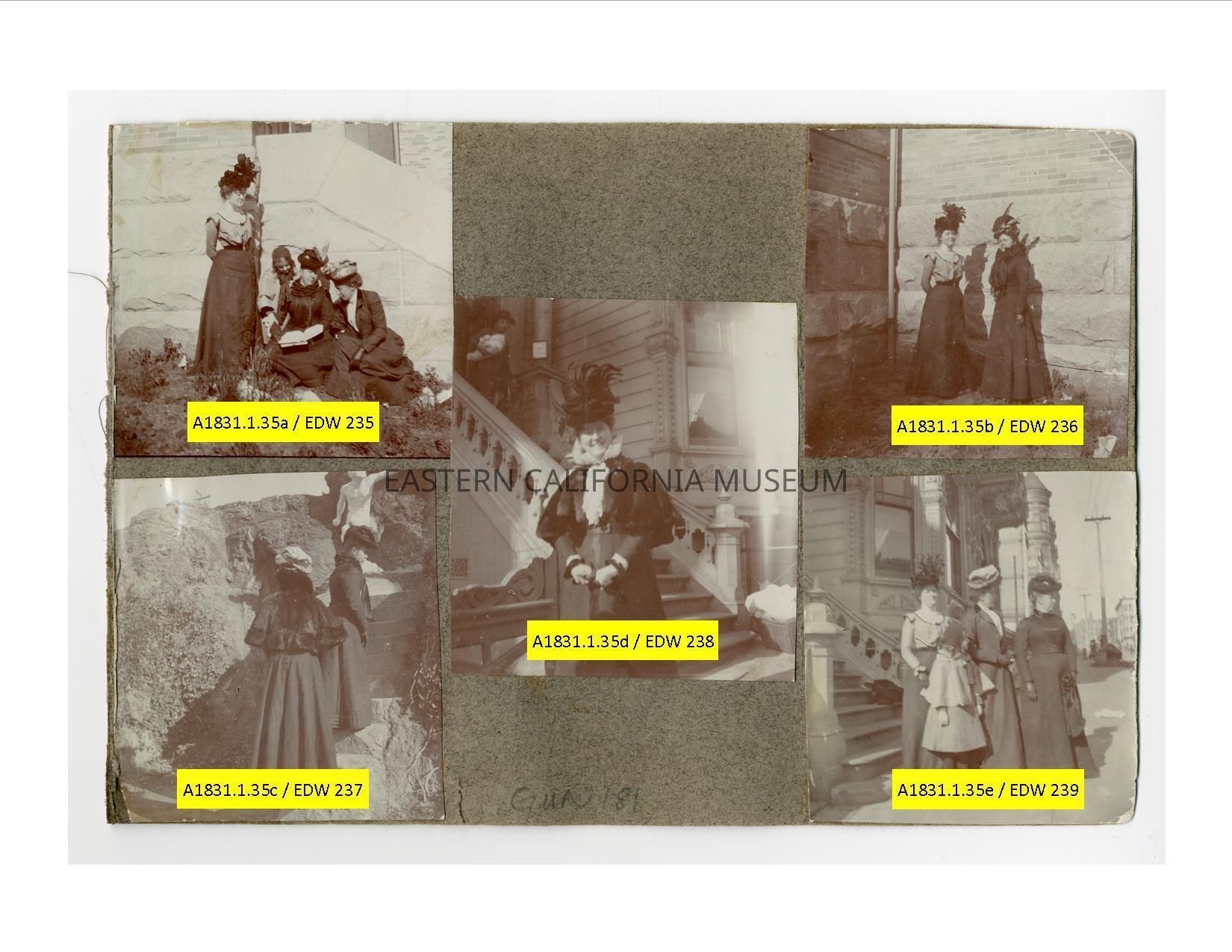 A1831.1.35e: Exterior photo of three women and one young girl standing in front of the ornate building in the previous photo. The young girl may be Helen Gunn.Collection