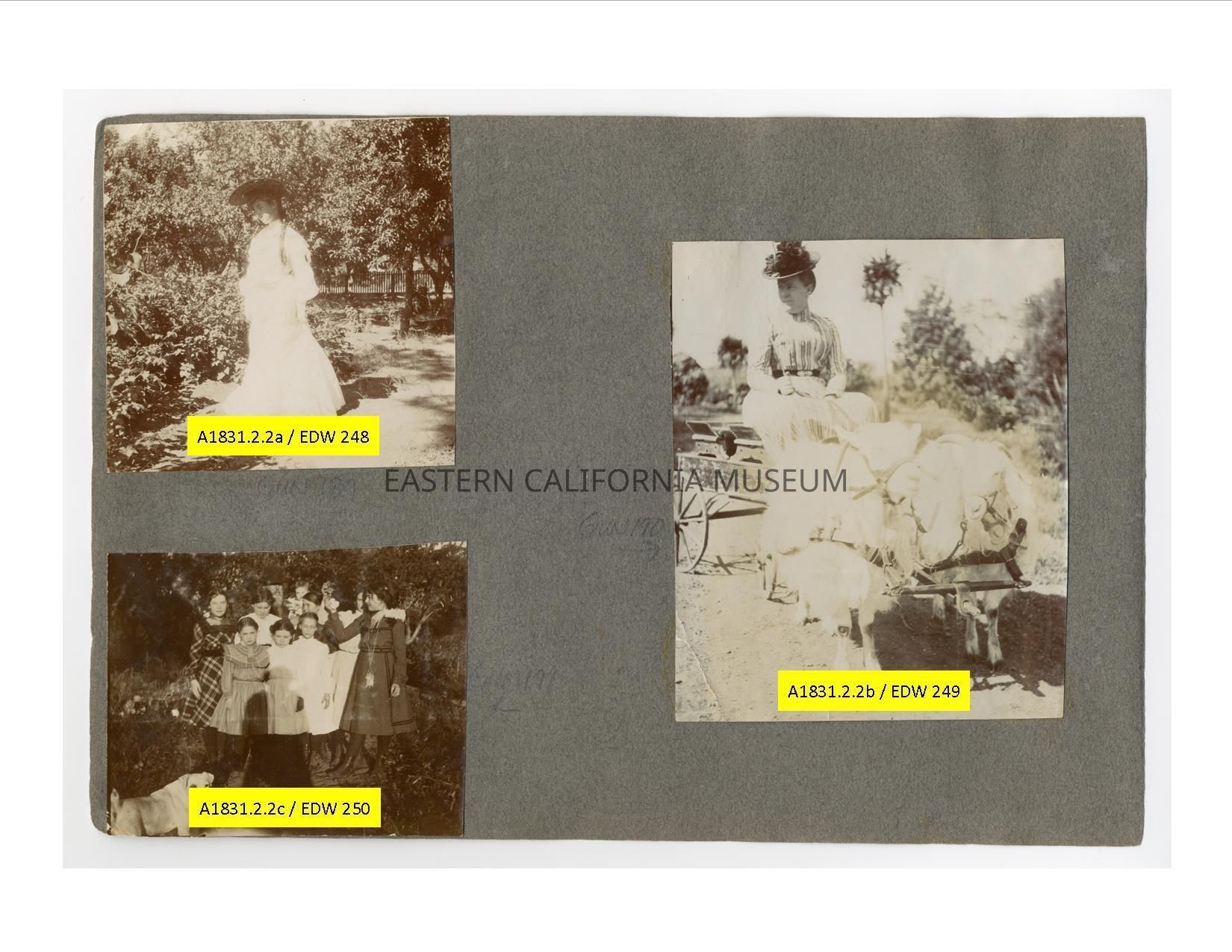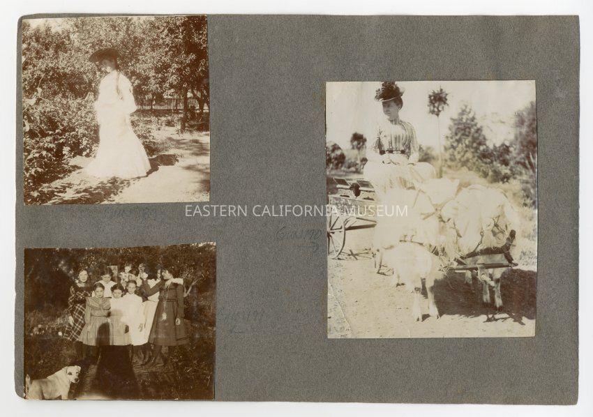 A1831.2.2b: Photo of a woman sitting in a small wagon pulled by two goats or sheep. She might be Margaret Shepherd?