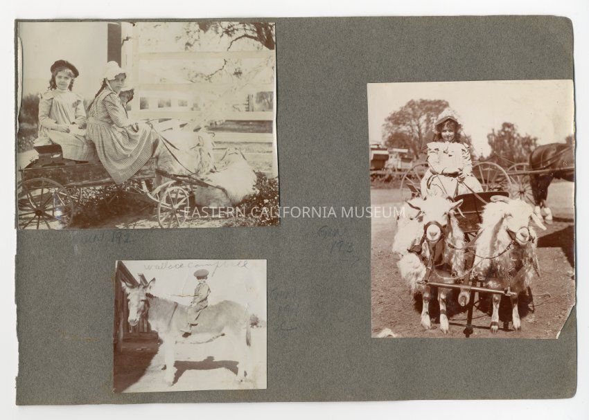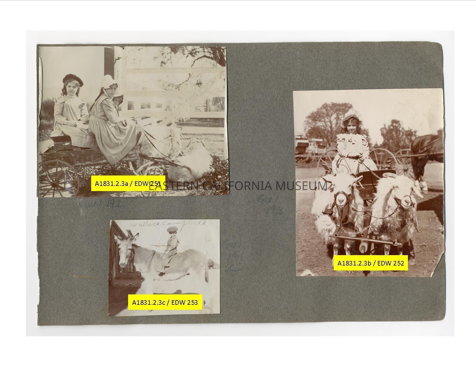 A1831.2.3a: Exterior photo of three young girls on a small wagon being pulled by two goats or sheep (currently at rest). The girl on the left may be Helen Gunn.