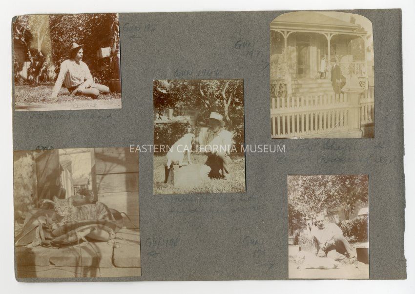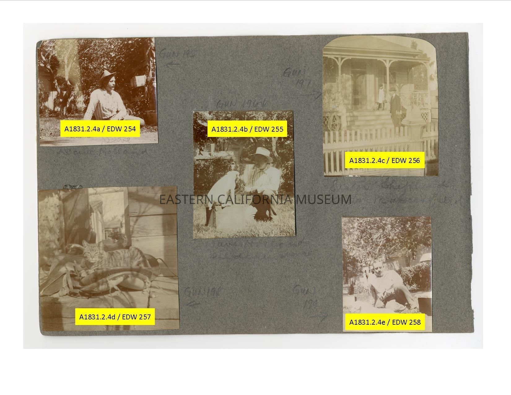 A1831.2.4c: Exterior photo of a man, young girl, and dog standing in front of a house. The photo is labeled, "Lester Shepherd, Rena, Bakersfield."