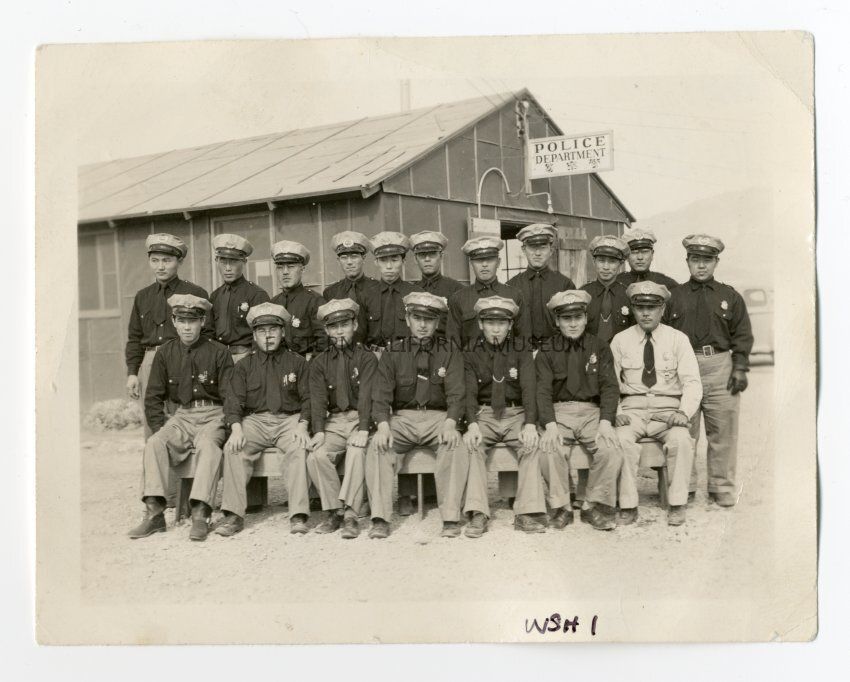 Exterior photograph of eighteen uniformed officers of the Manzanar Police Department. They are in two rows with the front row seated. Behind them is a barracks building with the sign "Police Department."
