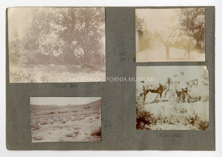 A1831.2.5d: Exterior photo of two people on horseback with another man standing next to what appears to be a wagon wheel. There is also a packed mule.Collection