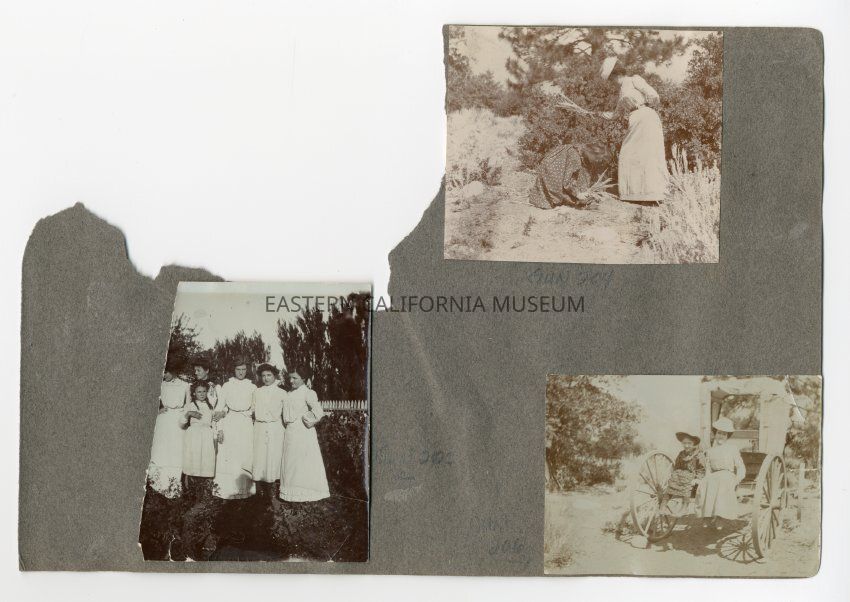 A1831.2.6a: Exterior photo of a young girl and woman. The young girl, possibly Helen Gunn, is bent down collecting plants.
