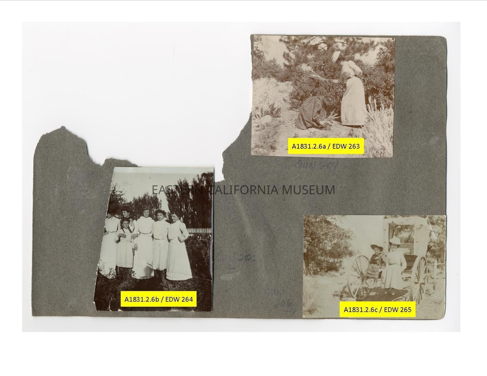 A1831.2.6b: Partial exterior photo of six women and young girls wearing white dresses in a garden. One of the girls may be Helen Gunn.