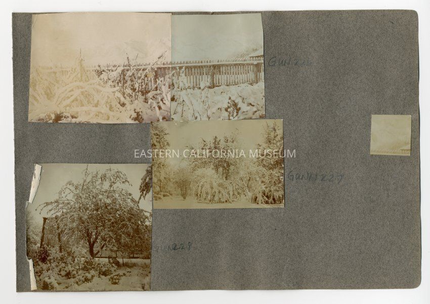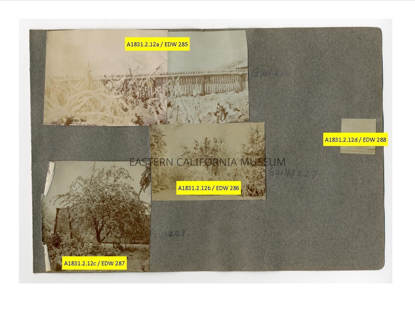 A1831.2.12c: Photo of a garden and tree covered in snow. There is a picket fence in the background.