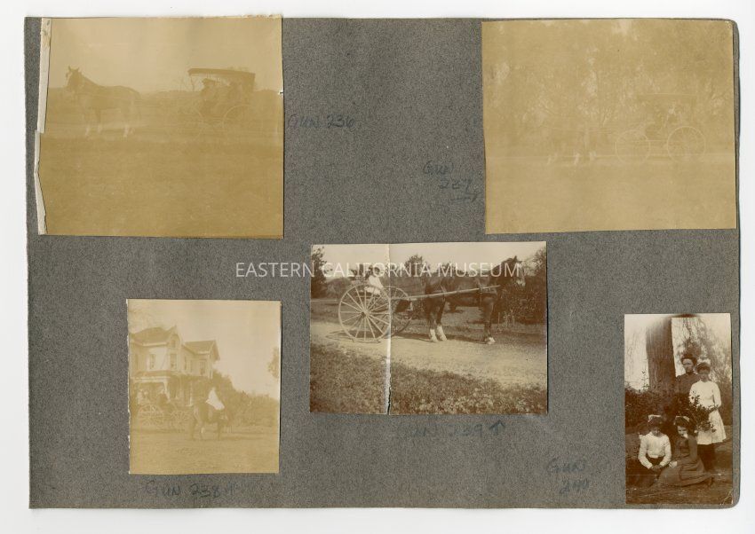 A1831.2.16c: Photo of a young girl on horseback in front of an ornate house. There are people in a buggy or wagon behind her. Photo is badly faded.