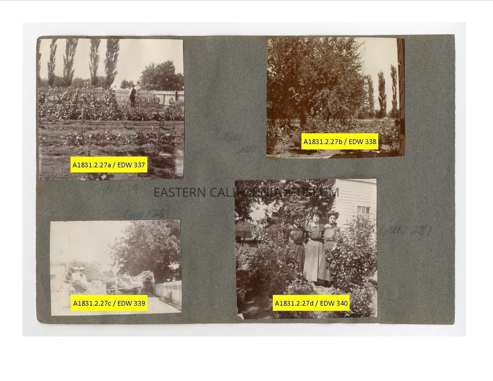 A1831.2.27d: Exterior photo of three unidentified women in a garden in front of a house. Possibly at Shepherd's Ranch at Georges Creek.Collection