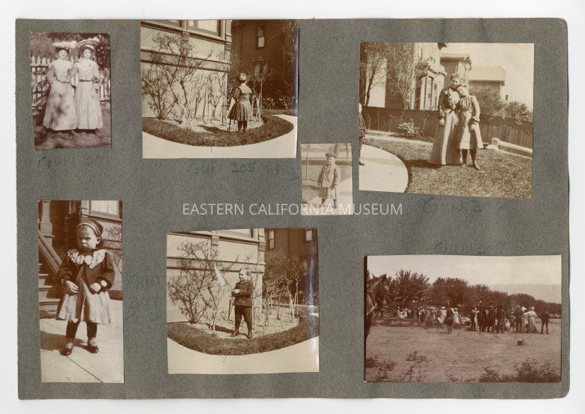 A1831.2.32a: Exterior photo of two young ladies standing in front of a white picket fence. One of the girls is identifed as Helen Gunn.