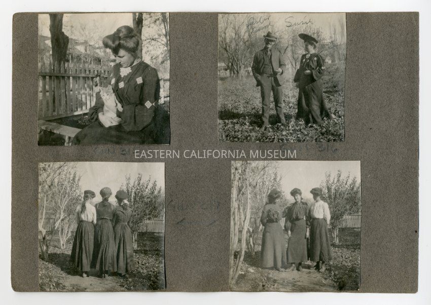 A1831.2.35d: Exterior photo of three young women facing the camera. They are standing on a dirt pathway at the Hannah House in Independence. Helen Gunn is wearing the plaid blouse.Collection
