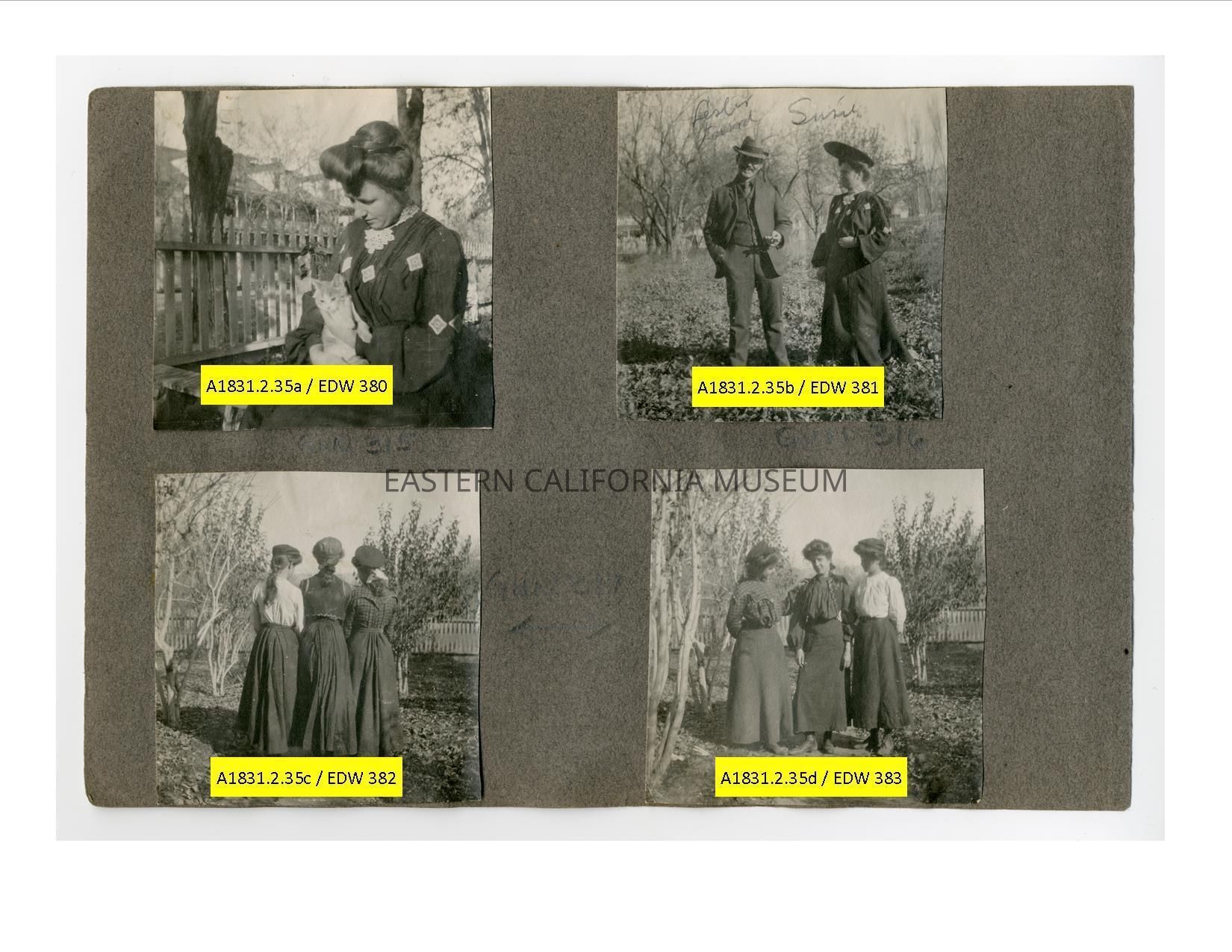 A1831.2.35c: Exterior photo of three young women with their backs to the camera. They are standing on a dirt pathway at the Hannah House in Independence. Helen Gunn is wearing the plaid blouse.