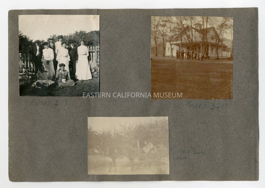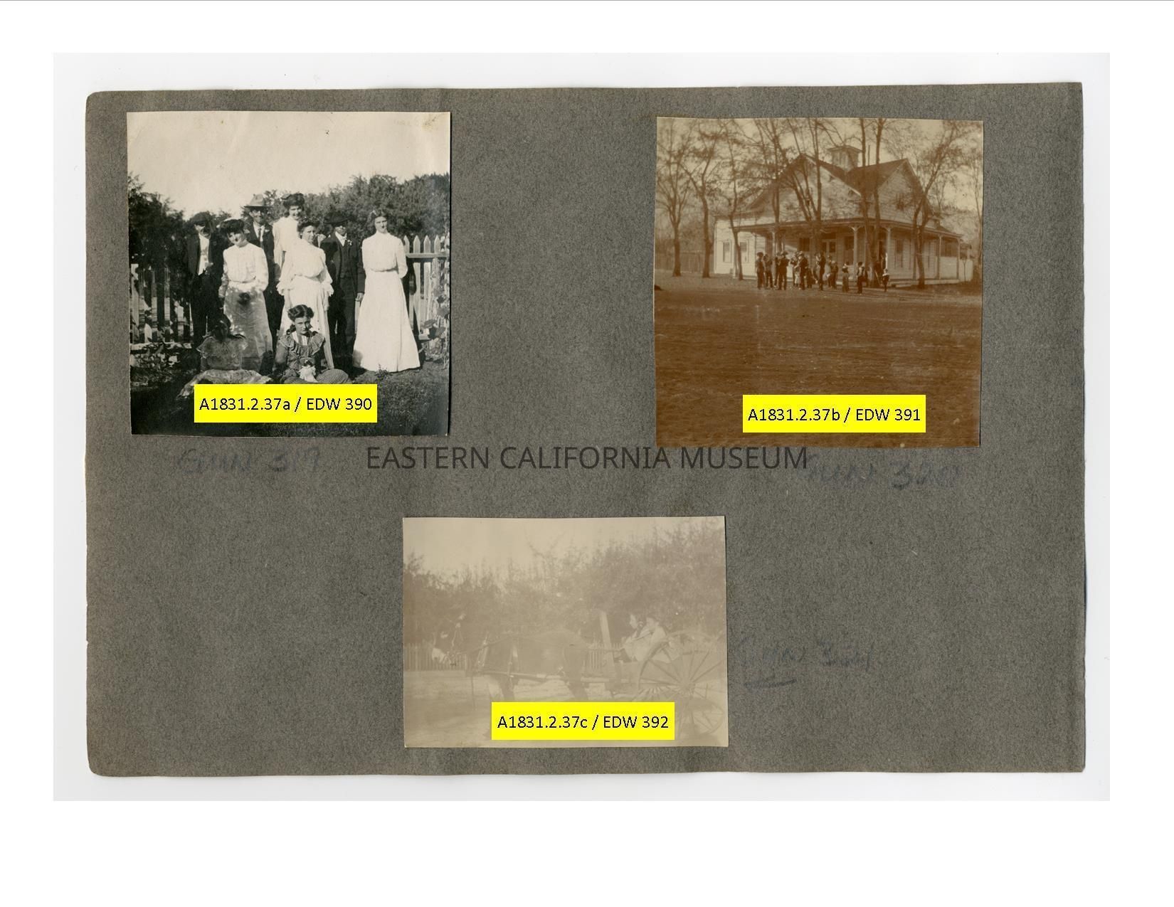 A1831.2.37c: Photo of two girls in a two-wheeled cart pulled by a donkey or burro. Photo is badly faded.Collection