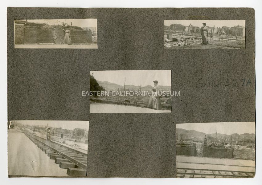 A1831.2.42d: Photo ofa woman standing next to train tracks. There appear to be ruined buildings behind her. She may be Margaret Shepherd standing standing amid ruins from the 1907 San Francisco earthquake.