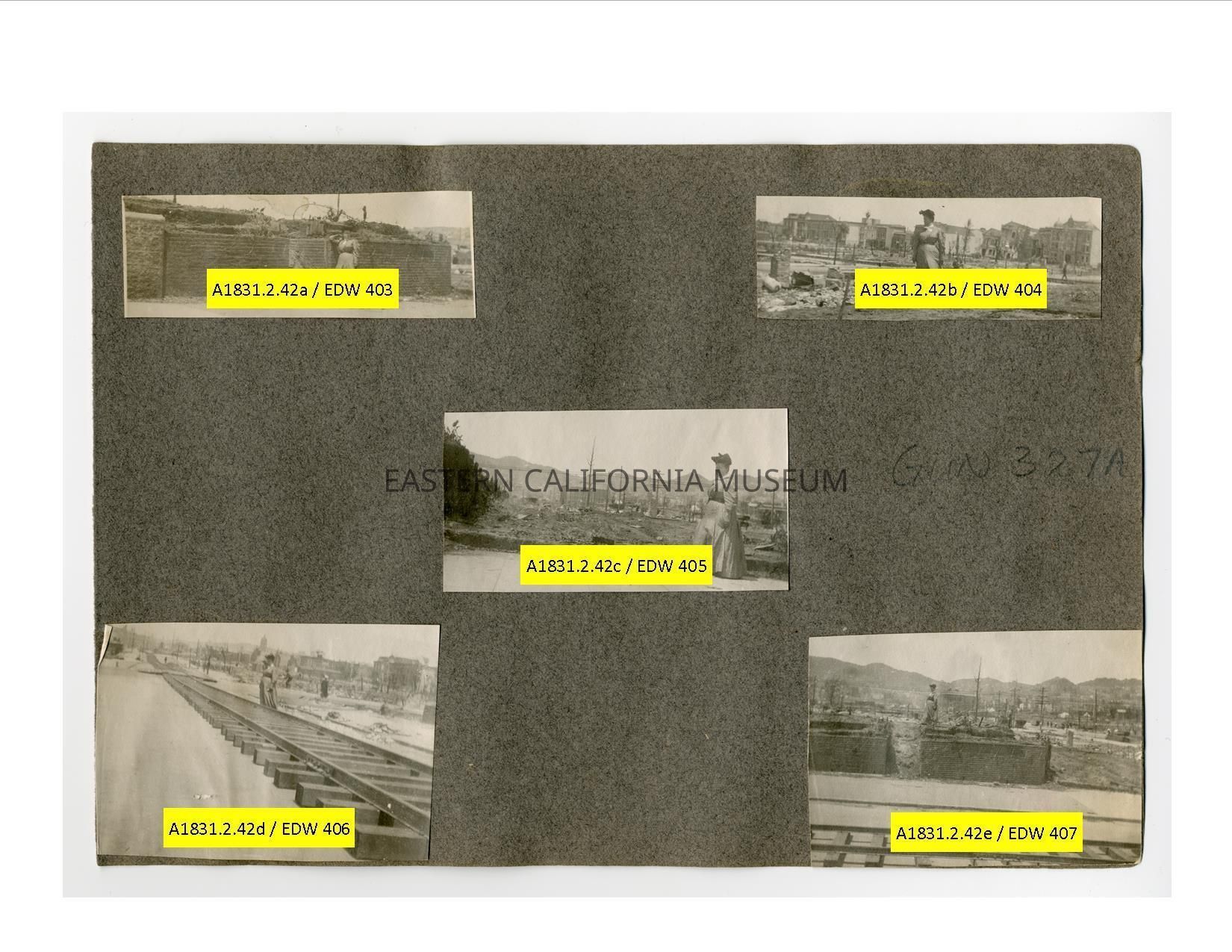A1831.2.42b: Photo of a woman standing next to rubble with buildings in the distant background. She may be Margaret Shepherd standing standing amid ruins from the 1907 San Francisco earthquake.