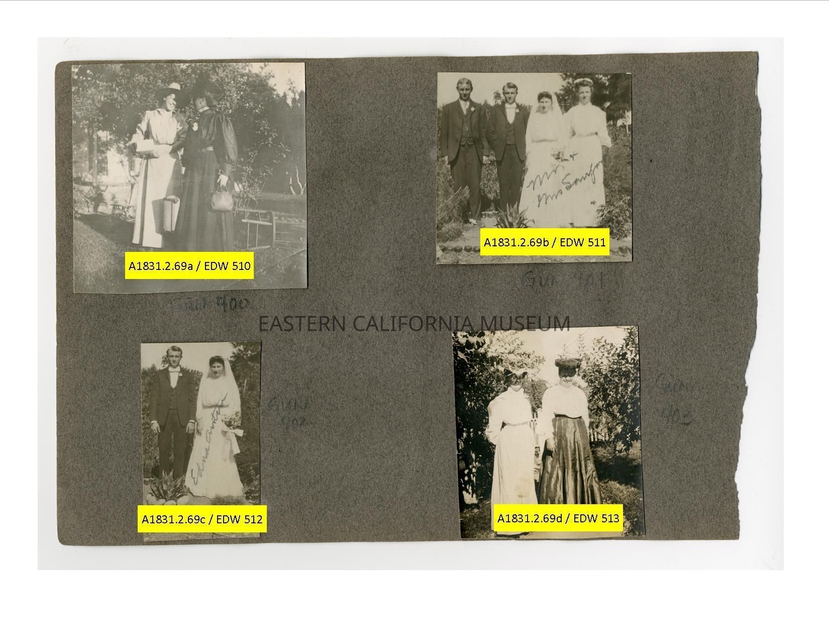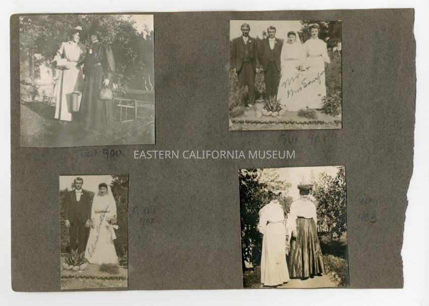 A1831.2.69b: Exterior photo of a wedding party consisting of two men and two women (one is wearing a veil). They are identified as Mr. and Mrs. Sanford. The bride was Edna Anton, the groom was Frank Lee Sanford, and they were married at the home of M. Anton in Independence on September 10, 1906. The bridesmaid was Mary Albers and the groomsman was Clarence Anton (the bride's brother).