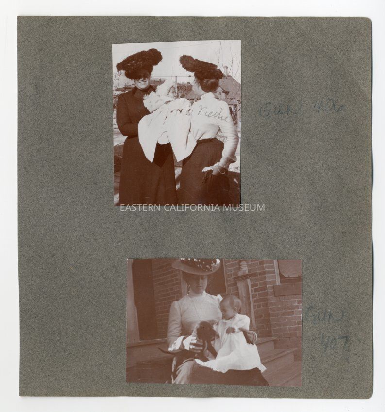 A1831.2.72a: Exterior photo of two women wearing black hats holding a baby. The woman on the right is identified as Nettie (Irwin?). The woman she is with may be her Aunt, Mrs. Loomis, whose house in El Paso, Texas this photo was taken at.