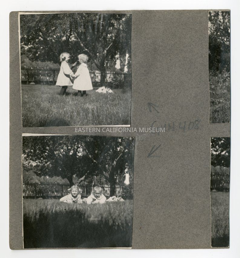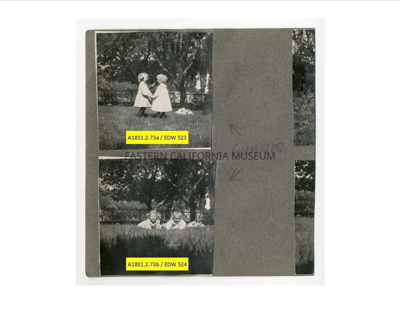 A1831.2.73a: Exterior photo of two children standing on a grassy lawn. They are identified as Eloise and Florence Shepherd.