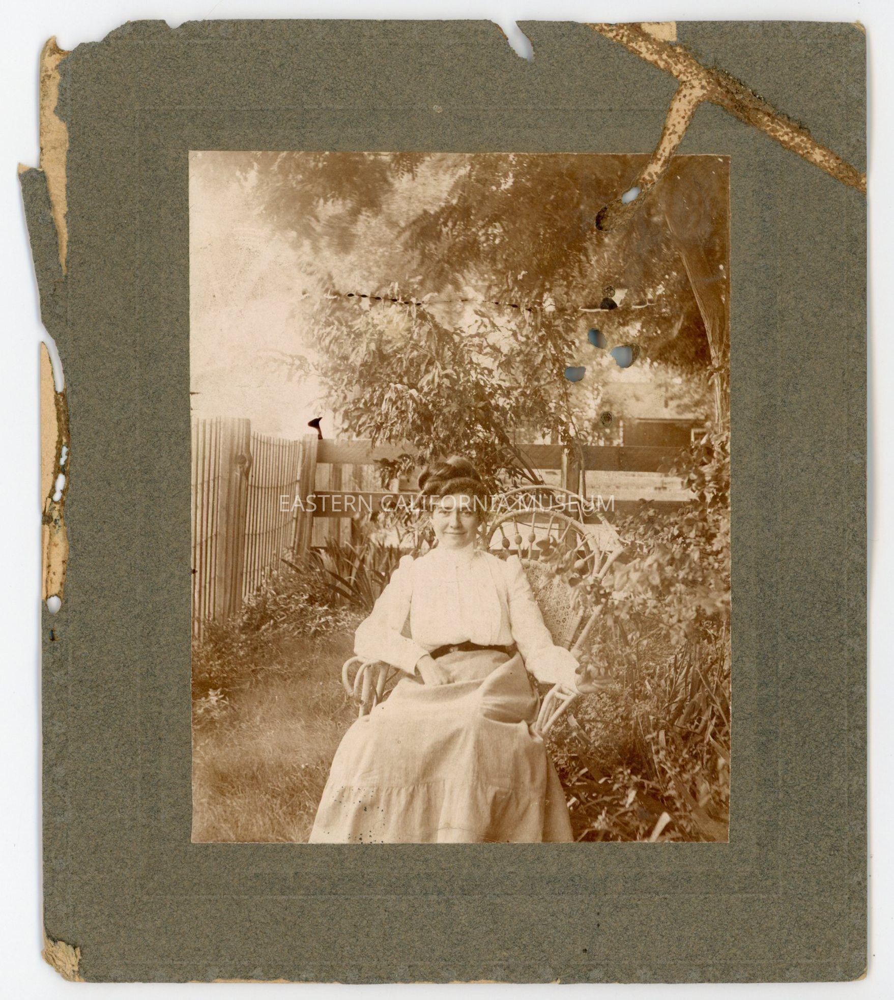 Damaged mounted photo of a woman sitting in an airy wicker chair outside.Collection