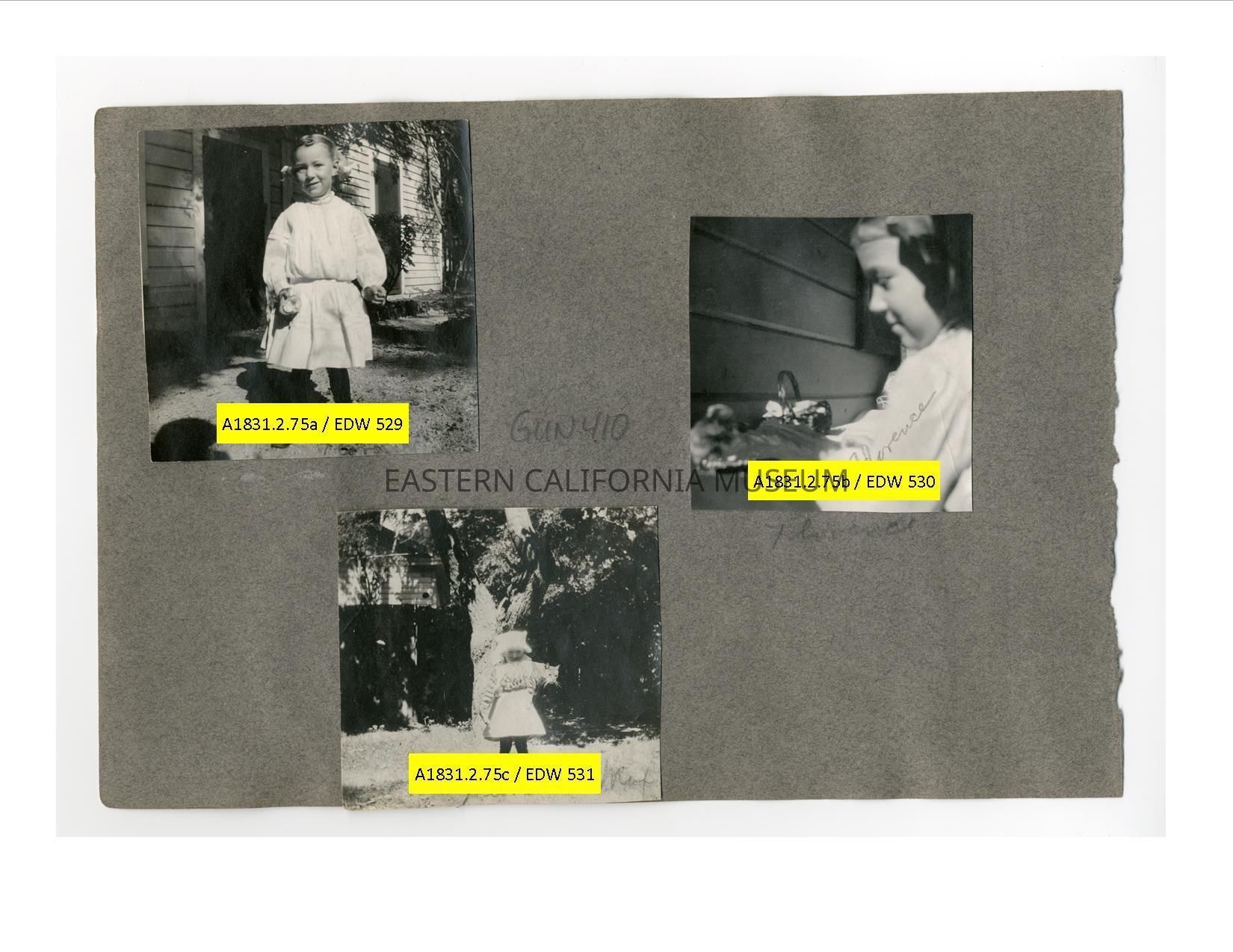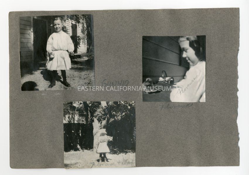 A1831.2.75a: Exterior photo of a young girl identifed as Florence Shepherd. She is holding something in her right hand and is standing in front of a house.
