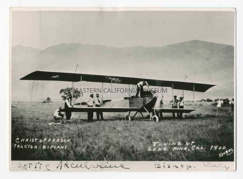 B&W. Plane parked in the middle of a field with several people (eight) around it. A couple other people standing near a vehicle on far right in distance. Trees, mountains in background. Photo is labeled on front, "Christofferson Tractor Biplane" and "Tuning up, Lone Pine, Cal. 1900" and "Forbes." There is an additonal label that has been handwritten in black ink that says, "Lottie Arcularius, Bishop, Calif."