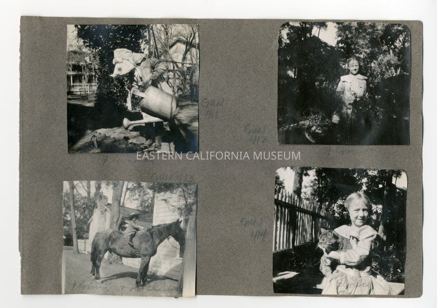 A1831.2.76c: Exterior photo of a young girl mounted bareback on a horse. She is identified as Florence Shepherd and Old Charly.