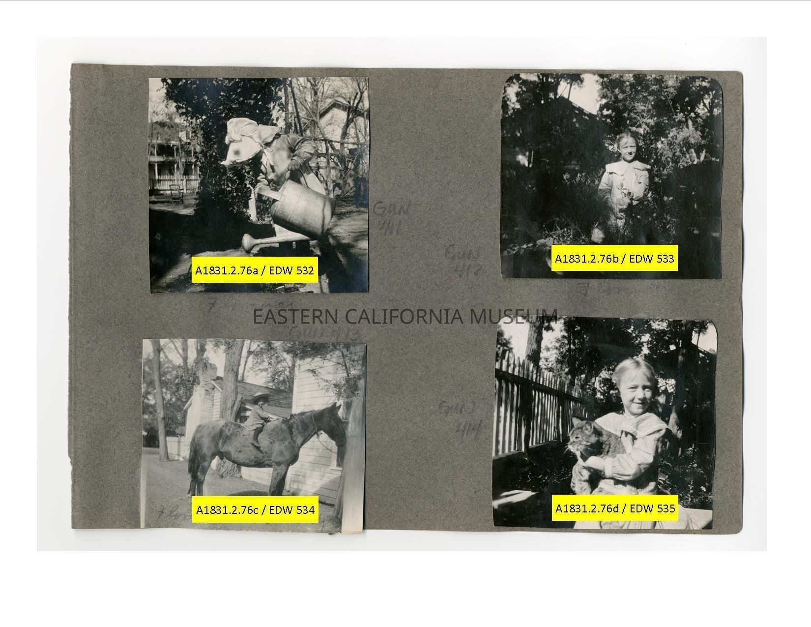 A1831.2.76d: Exterior photo ofa young girl holding a cat. She is identified as Florence Shepherd, and the cat might be named Max.Collection
