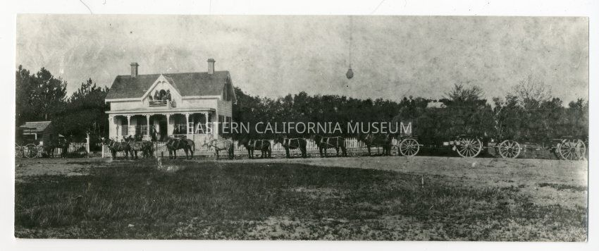 B&W. Photo of a house with a mule team and wagons out front. Several people standing on small balcony on second story of house. Trees and Sierra Nevada in background.