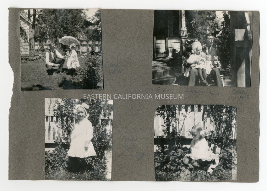A1831.2.78b: Exterior photo of a man sitting on a chair with a little girl in his lap. He is also holding a teddy bear and doll while the little girl cradles a second doll in her arms. They are identified as Ed and Florence Shepherd.