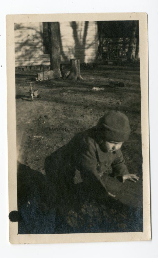 B&W. Digital only, the hardcopies were returned to owner after scanning. Small child/toddler (Clyde Reynolds) playing outside in yard with what might be a wagon or something with wood and wheels. House, trees, and a little tricycle in background. Child is wearing a jacket and hat--must be cold.