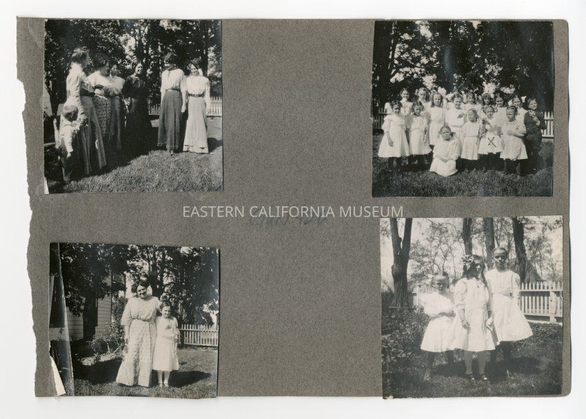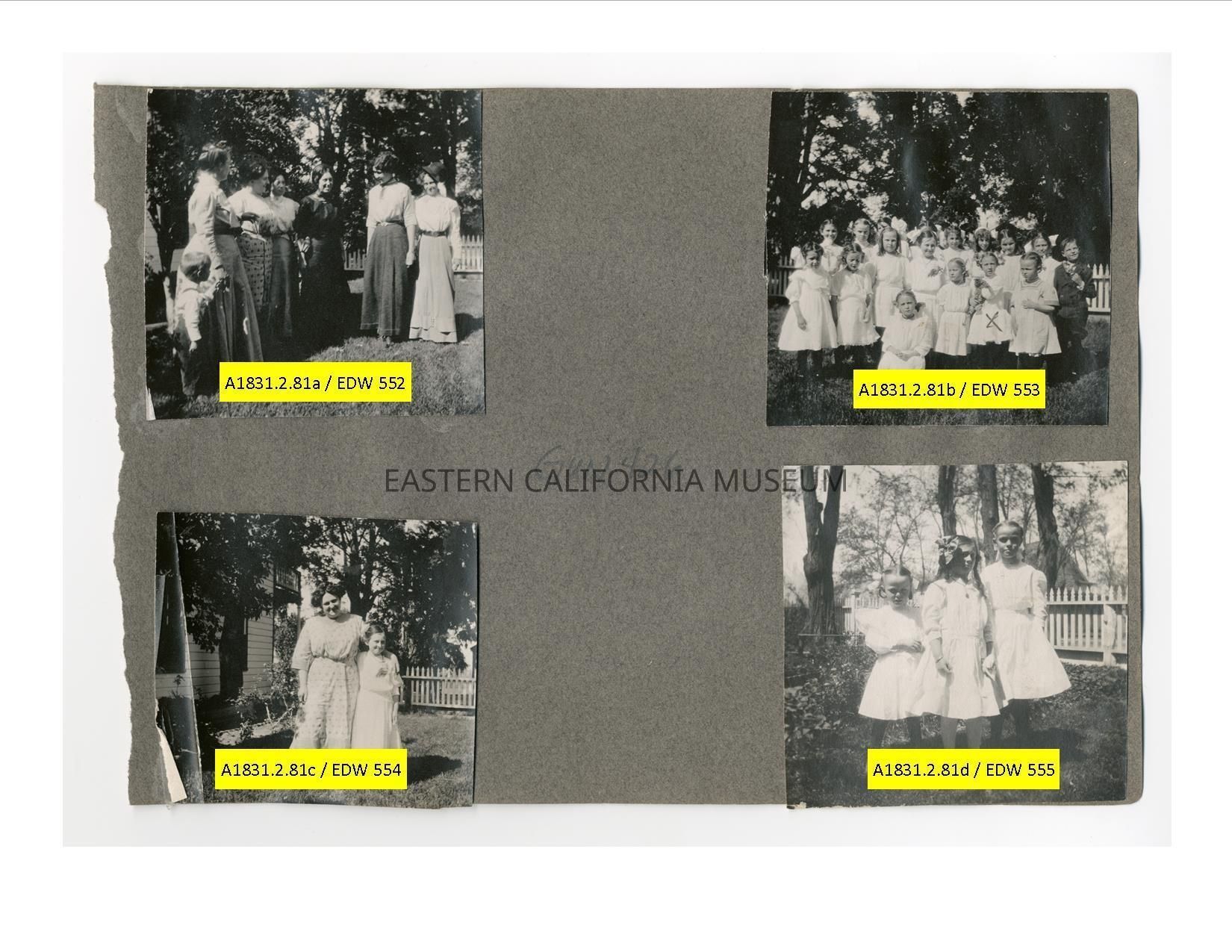 A1831.2.81d: Exterior photo of three young girls wearing white dresses standing in a fenced-in yard.Collection