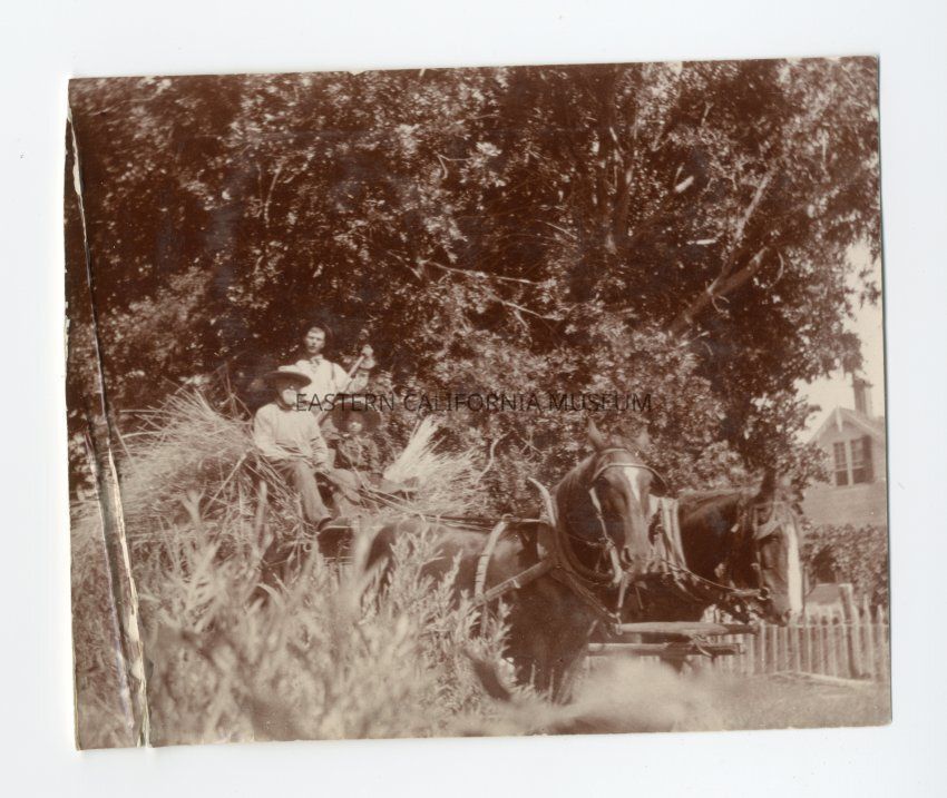 Photo of three people on a wagon (full of hay) being hauled by two horses. There is a house in the background. It is identified as members of the Shepherd family on Shepherd's Ranch near Georges Creek.