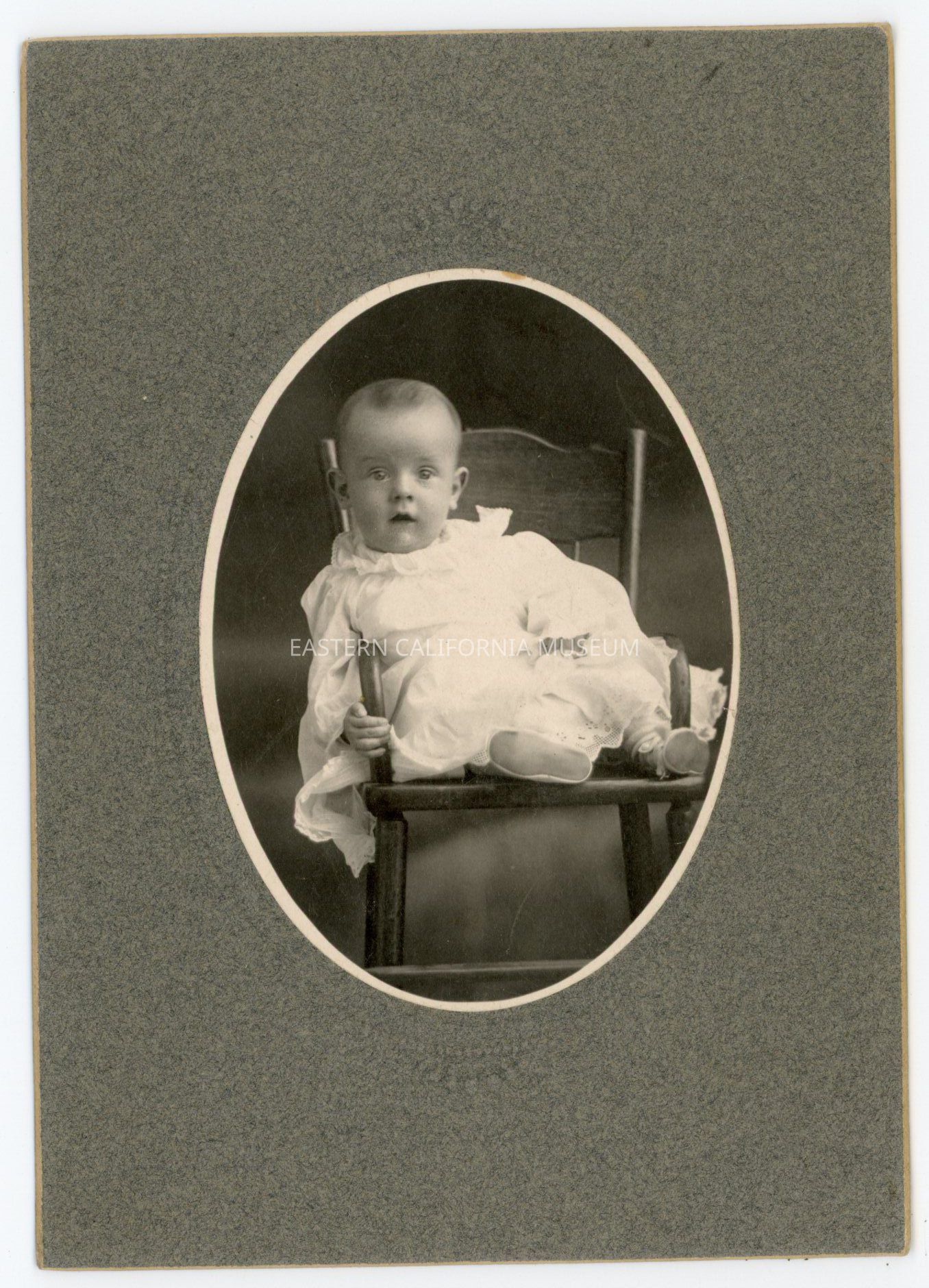 Mounted studio portrait of a baby in white sitting on a wooden chair.Collection