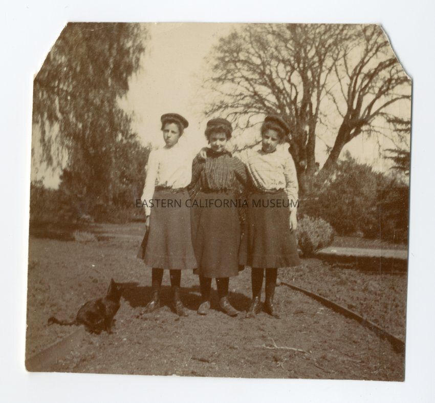 Photo of three girls standing with their arms around each other. There is a black cat in the lower left corner. The girl in the center is identified as Helen Gunn.