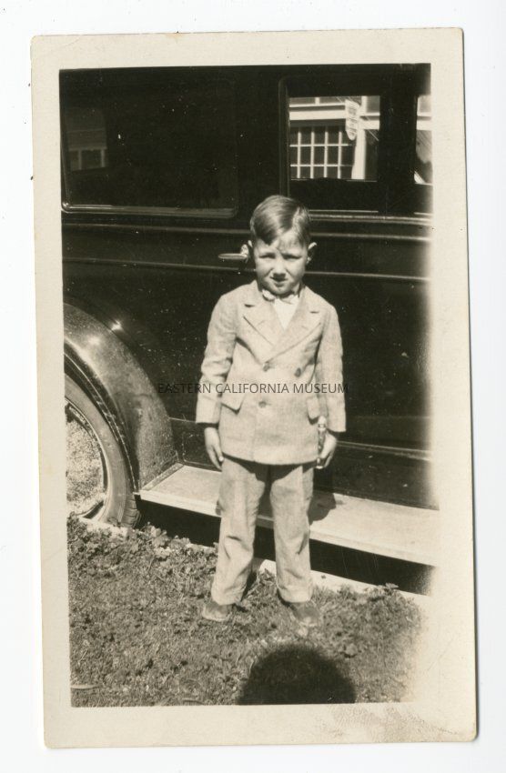 B&W. Digital only, the hardcopies were returned to owner after scanning. Young boy standing in front of a vehicle. Taken at the same date and location as 2013.12.8. Must be the Du Pont garage seen in the background through the car windows. Boy is dressed in a suit (matching jacket and pants), and is holding something in his left hand.