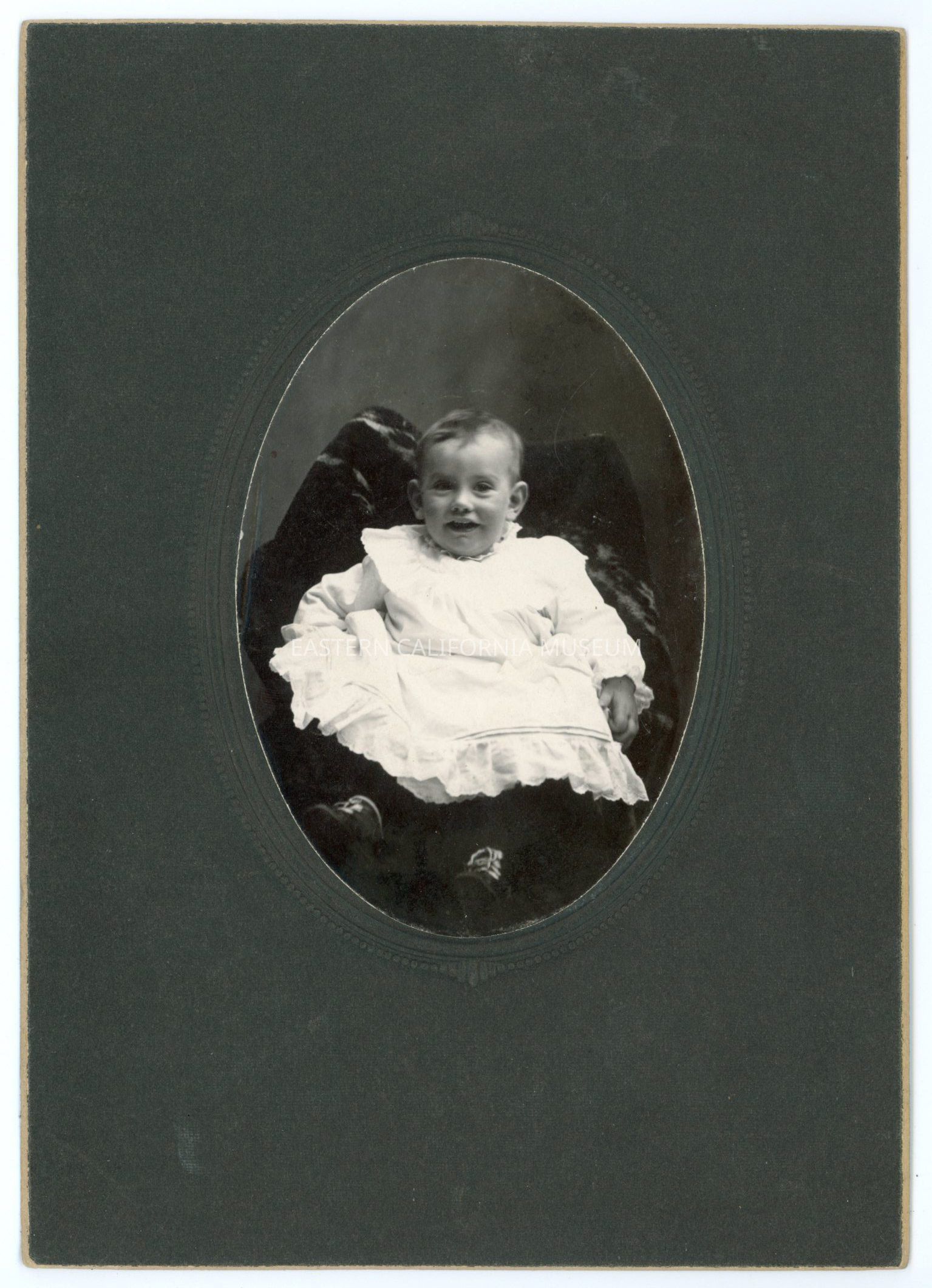Mounted studio portrait of a smiling young child in white.