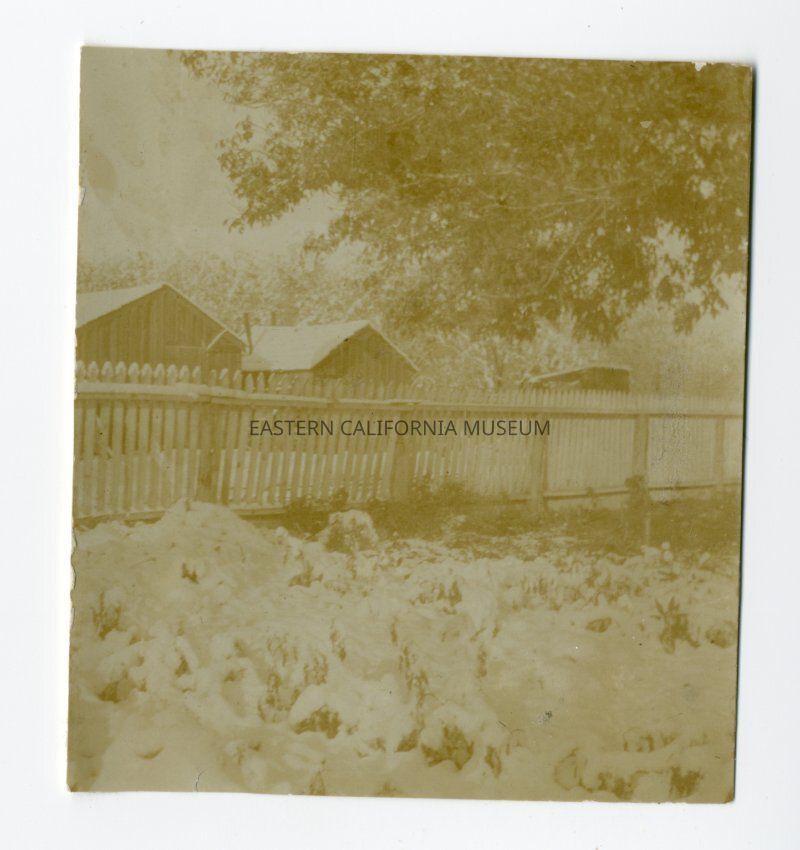 Small photo of a white picket fence and buildings covered in snow.