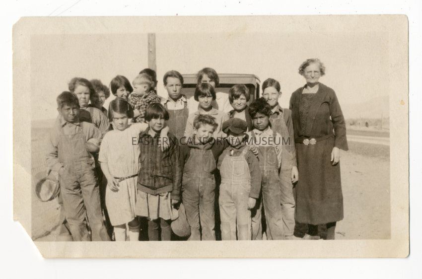 B&W. Digital only, the hardcopies were returned to owner after scanning. Large group of children and one older lady standing in front of a vehicle. Looks to be at least two native american boys (the one on the far left might be holding a baseball). Several children in the front row have their arms around each other.