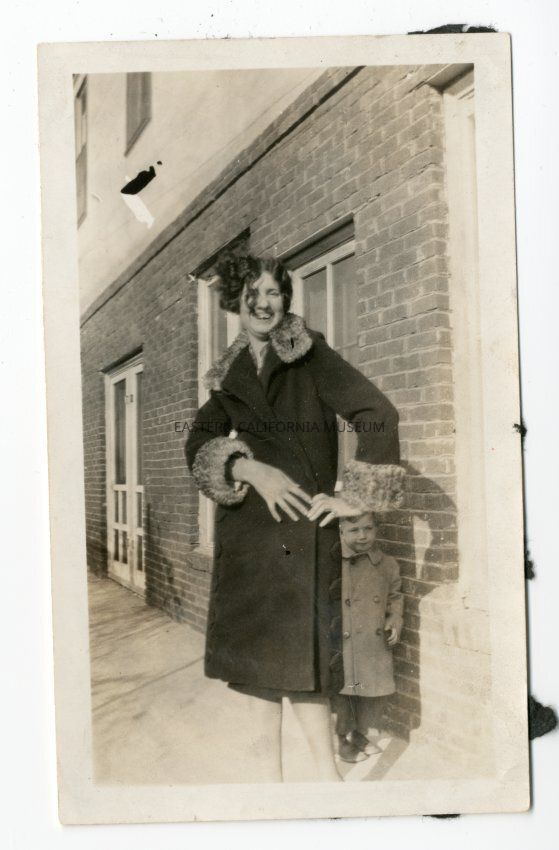 B&W. Digital only, the hardcopies were returned to owner after scanning. Woman standing in front of a brick building wearing a coat with fur at the cuffs and neck. Small boy standing behind her.