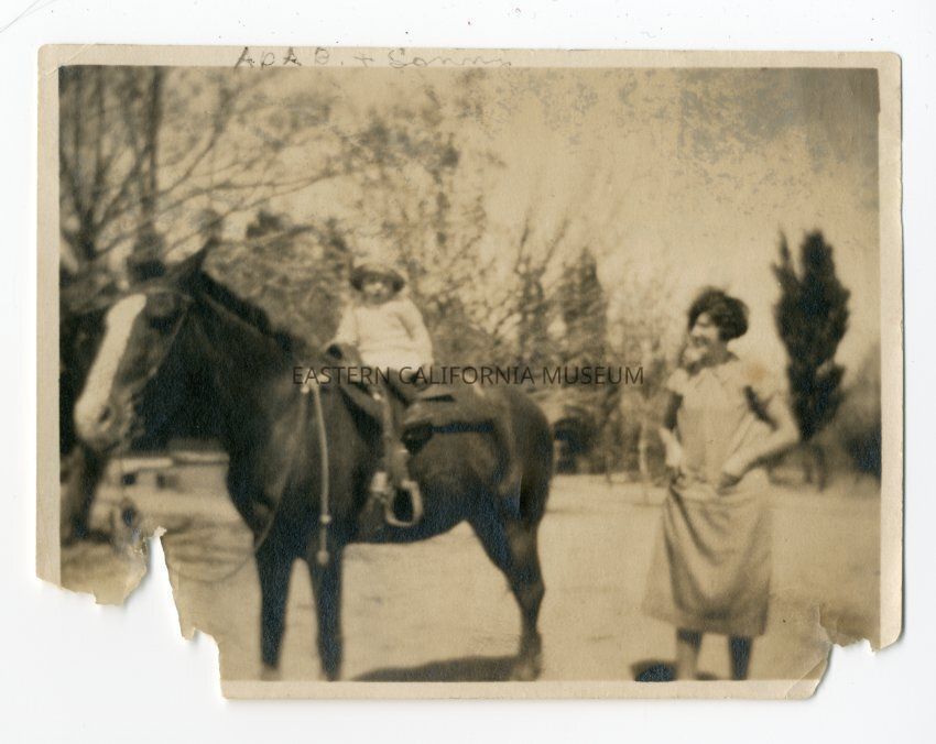 Sepia. Digital only, the hardcopies were returned to owner after scanning. Young child/toddler/baby on horse with a woman standing by watching him. Trees in background. Written on front of photo in black ink is, "Ada B. and sonny."