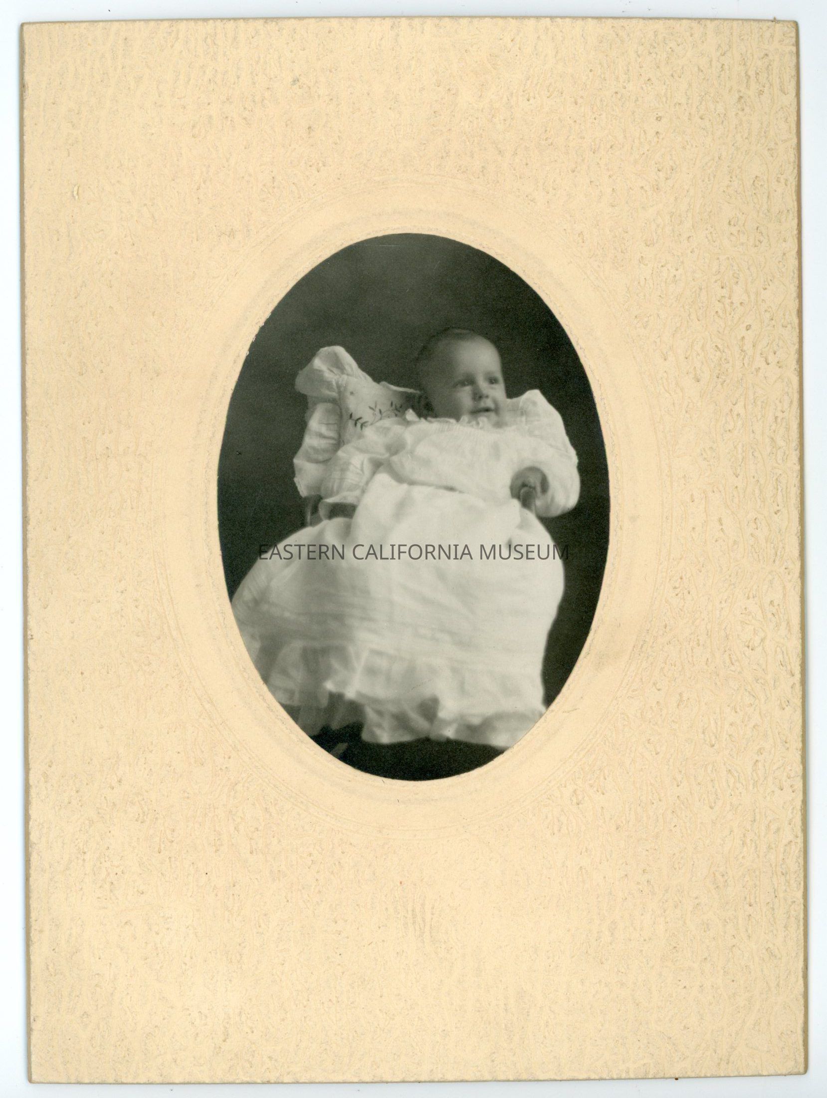 Mounted studio portrait of a baby in white. There may be a white, embroidered, ruffled pillow propping him up.Collection
