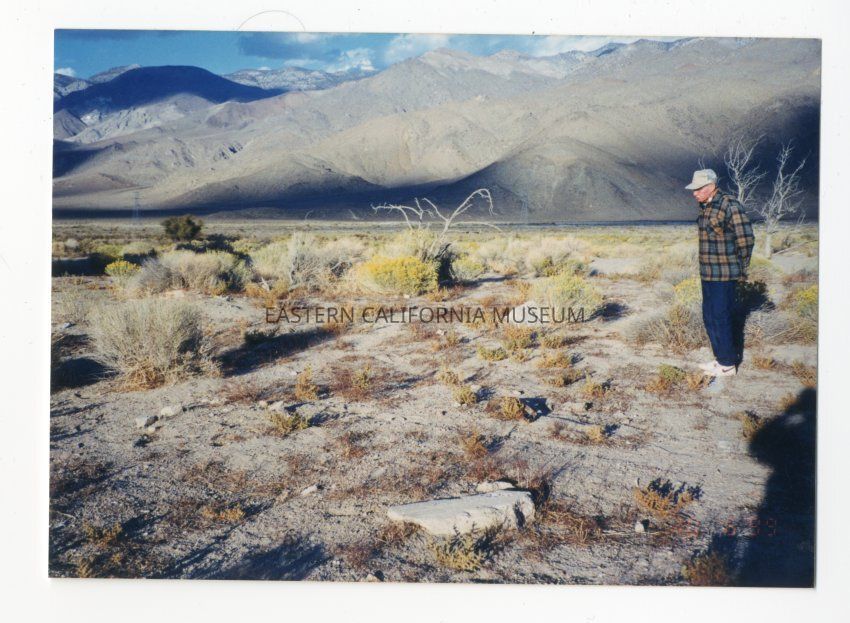 Color. Digital only, the hardcopies were returned to owner after scanning. Old man (probably Clyde Reynolds) standing near the remains of where he used to live as a small boy in Aberdeen. Ruins, foundations, sagebrush, mountains. Photo stamp on front of photo is 10/6/1999.Collection
