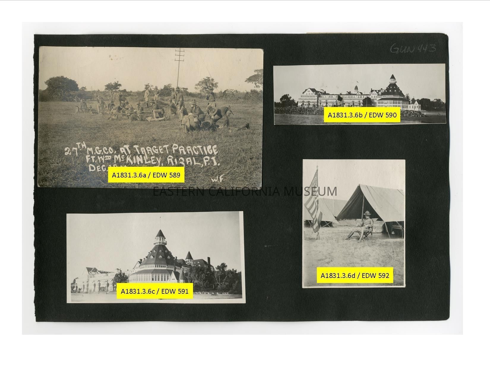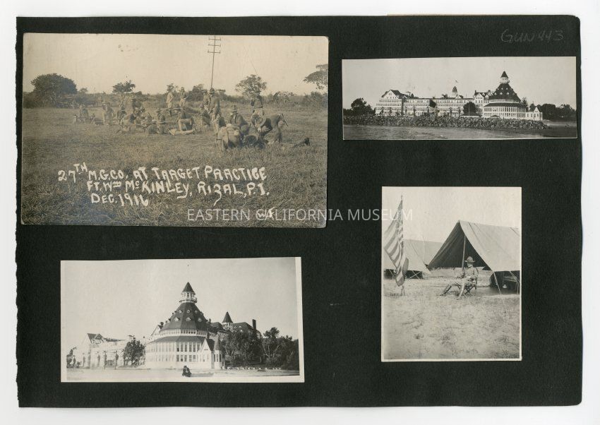 A1831.3.6a: Exterior photo of a military group doing exercises. It is labeled, "27th M.G. Co. at Target Practice. Ft. Wm. McKinley, Rizal, P.I., Dec. 1916. W.F."