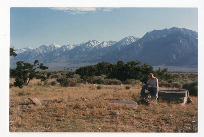 Color. Digital only, the hardcopies were returned to owner after scanning. Old man (proably Clyde Reynolds) sitting on some stone or cement remains. Mountains, trees, brush. Photo stamp on front is 10/6/1999.