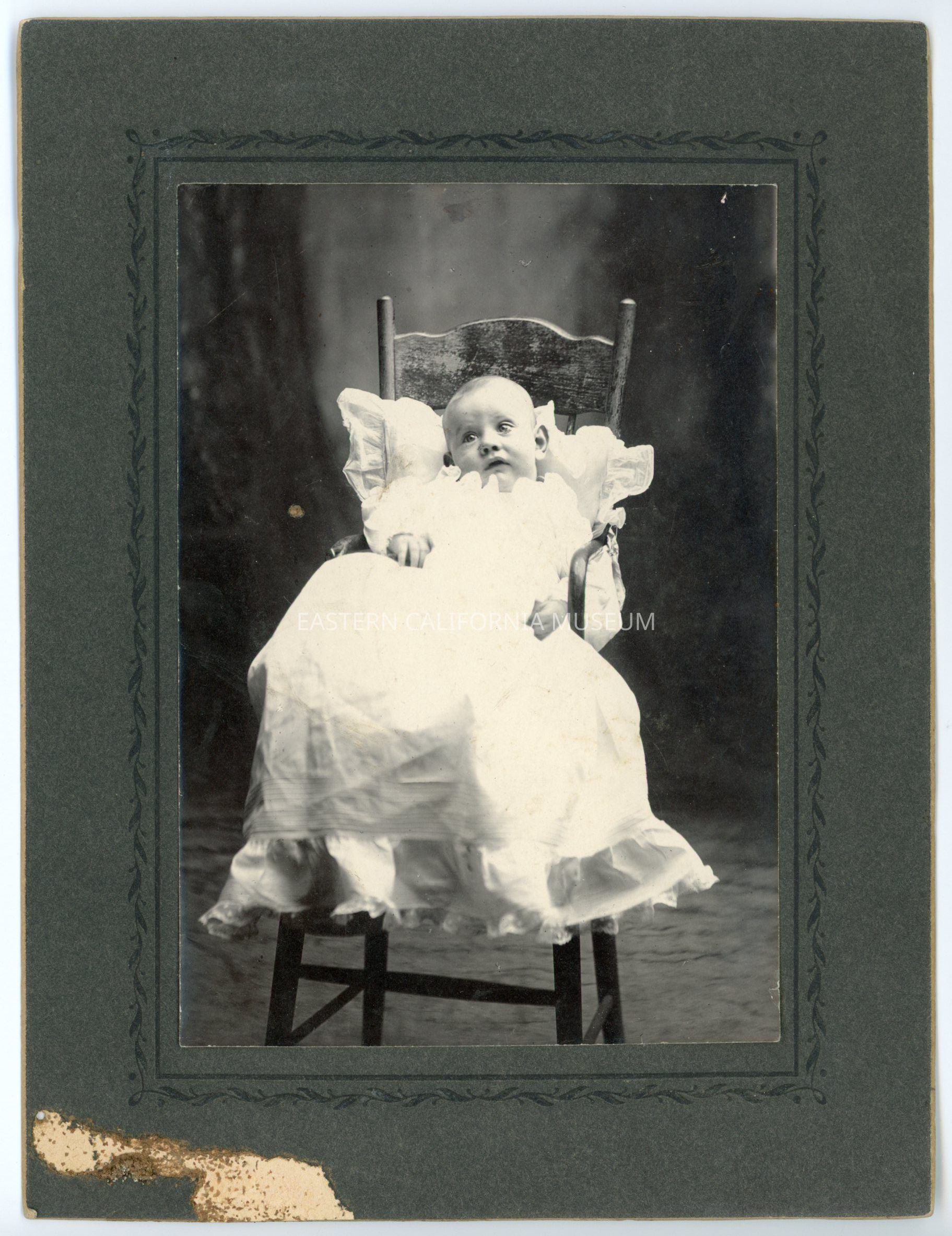 Damaged mounted studio portrait of a baby in a long white gown in a wooden chair.