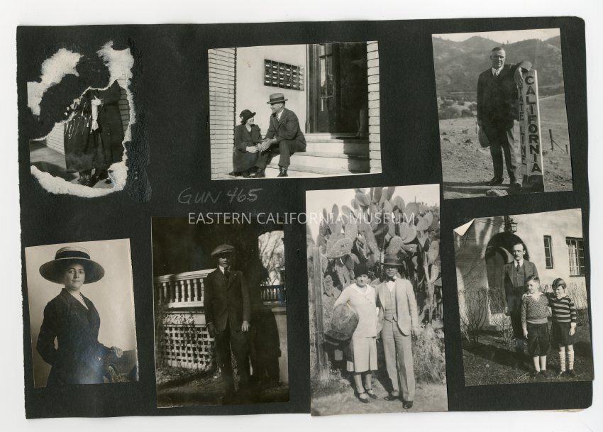 A1831.3.26c: Exterior photo of a man leaning against a marker at the California state line.