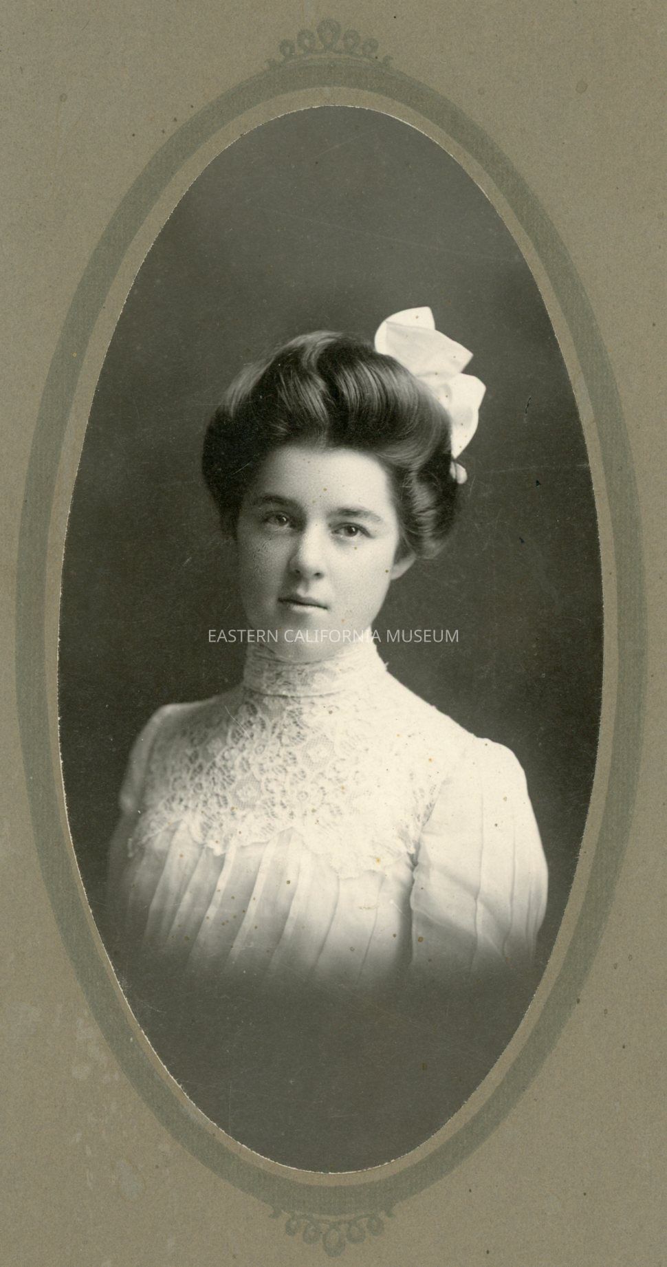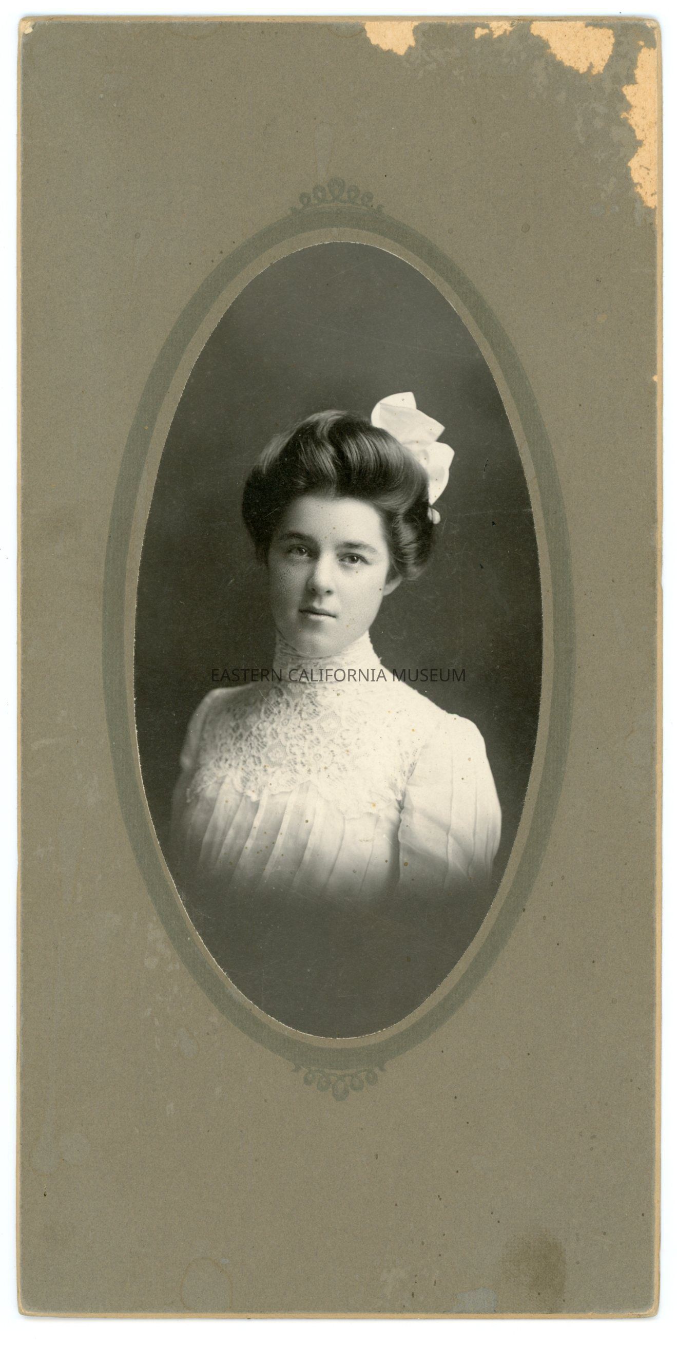 Mounted studio portrait of a young woman wearing a high-necked, white lace blouse with a big white bow in her hair.